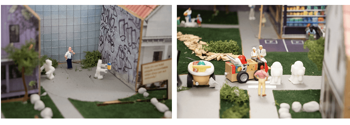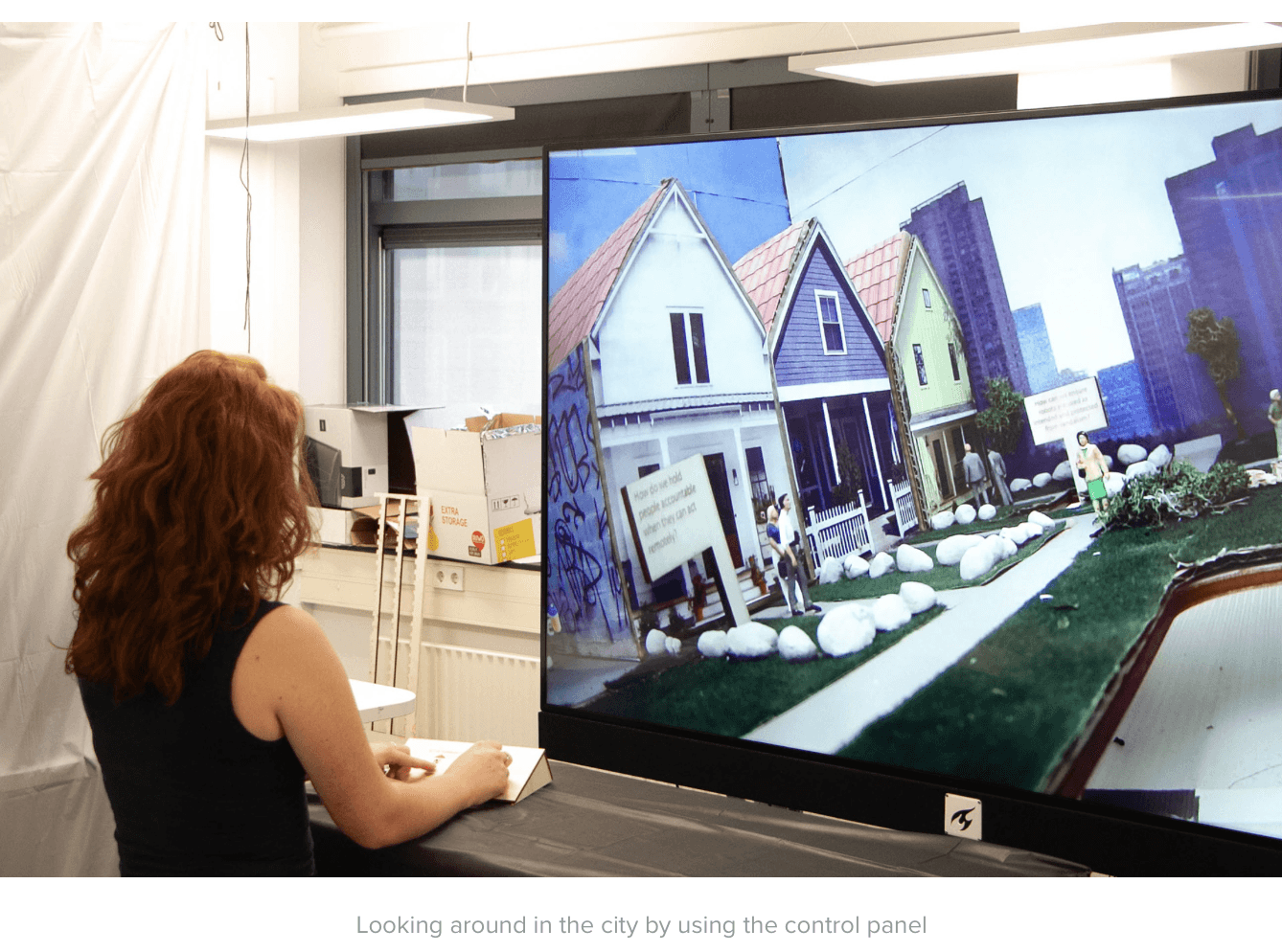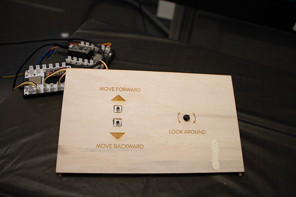 The creation of ‘City of Bots’ roughly consisted of two parts. The technological part, and the creation of the actual diorama. To let people be able to look into our created neighbourhood and ‘drive around’ in it, we attached a camera to a linear actuator. The camera was attached to a servomotor which made it able to turn around. With a potentiometer, people could turn the camera around themselves. They could also determine the position of the linear actuator themselves by extending it or pulling it back with two buttons. The potentiometer and the buttons were all integrated in a control panel, and connected to itsybitsy’s which were connected to the physical parts (linear actuator and servomotor).