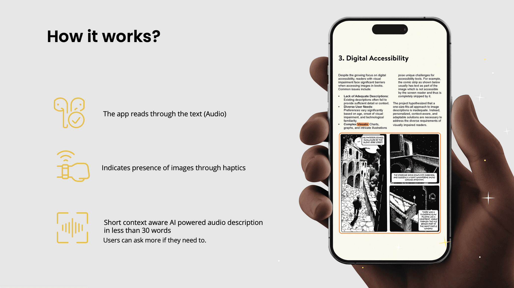 Haptic Feedback: Subtle vibrations alert users to an image, with optional prompts for additional details.
