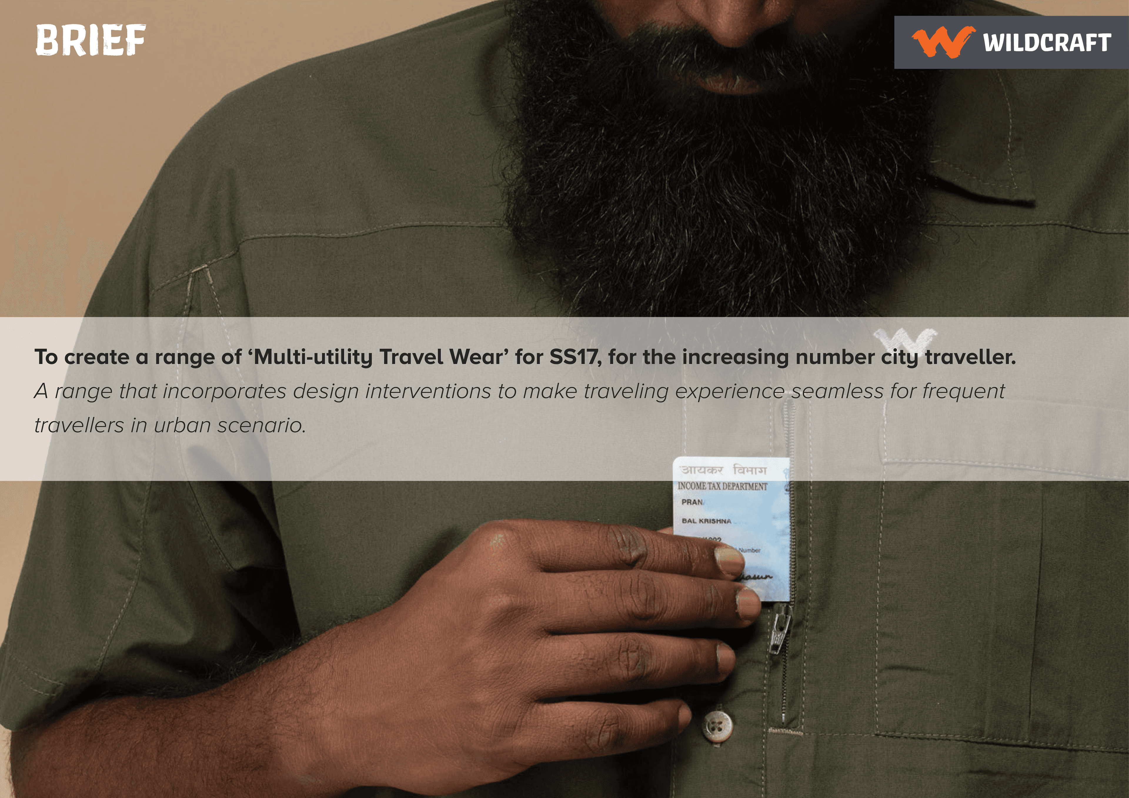 Wildcraft is an Indian outdoorwear company. At the time of this project, the brand was already getting known for it's accessories - especially bags and tents. There was a small range of clothing for outdoors (hiking, trekking etc). The company intended to further grow it's market from only outdoors to finding a use-case closer to cities. They had tested the market with a small/capsule collection of travel clothing, which had promising results.